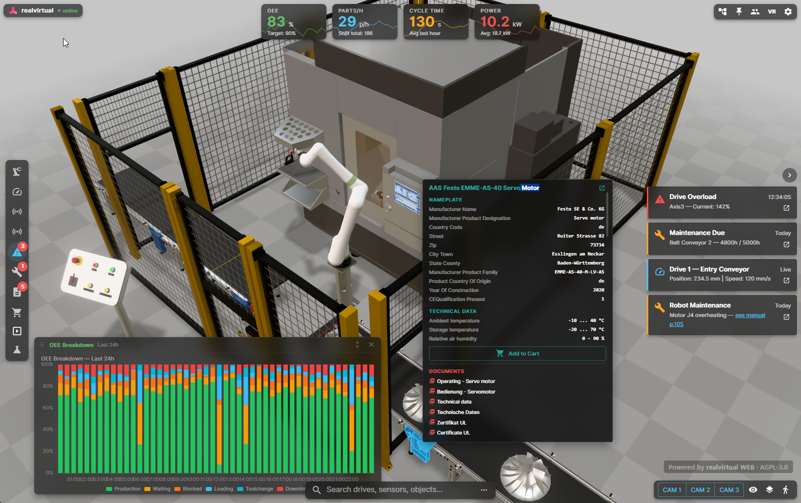 Technicians open a link on their tablet, click on a motor or valve, and see documentation, maintenance history, and real-time status — all in 3D context. The EU Machinery Regulation 2023/1230 (January 2027) enables digital-only documentation — realvirtual WEB delivers it with version control via Gitea and 10+ year availability.